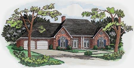 This elegant one story Georgian styled home is accented with its brick quoins, circle top windows and dentil mould. This plan features, spacious den with raised ceiling and corner fireplace. The dining area is open to the den and features built-in shelves and cabinets. The bedrooms are designed in a split fashion. The master suite offers a vaulted ceiling, private bath and walk-in closet. The plan finishes with a full size two car garage and double storage rooms.