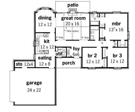3 bedrooms and 2 baths in this Country design, separate entry foyer, formal dining area, great room with 4″ drop and built-in fireplace, large eat-in kitchen, covered front porch, rear patio and 2-car garage with storage room.