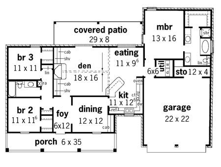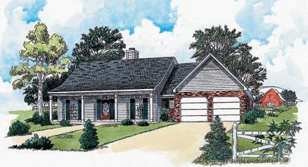 This traditional country styling of this home is most appealing with the covered front and rear porches and its split bedroom layout. This plan features a vaulted ceiling and fireplace flanked by cabinets and bookshelves which is open to the breakfast area and kitchen with an angled eating bar. The secluded master suite offers a private bath with whirlpool tub , separate shower, and walk-in closet.