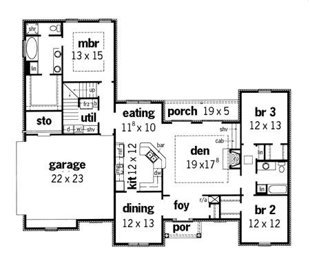 This design features, 3 bedrooms and 2 baths, formal entry foyer, dining area, den with fireplace and built-in cabinets, eat-in kitchen with breakfast bar, master suite with double vanity, separate shower, and large walk-in closet.