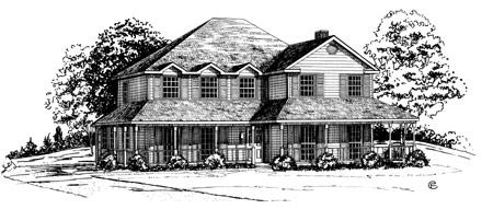 This plan features 4 bedrooms and 2 1/2 baths, formal dining and living area, separate entry foyer, open kitchen with bay window in eating area, wet bar off of den, fireplace flanked by cabinets and shelves in den, covered wrap around porch and rear patio.